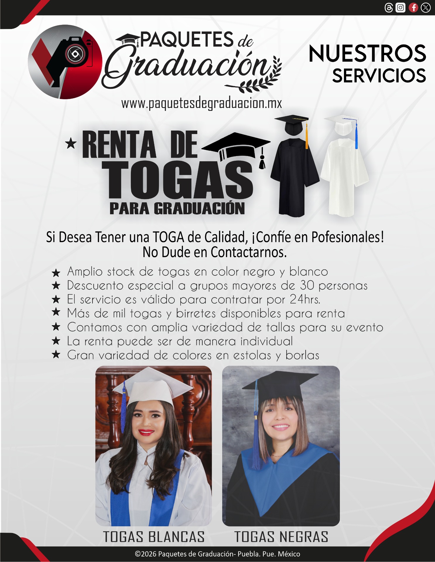 Ofrecemos el servicio de RENTA de TOGAS para Graduación con disponibilidad en color NEGRAS y BLANCAS